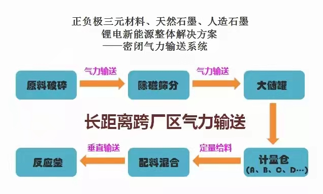 近年来,随着锂电行业的火速窜起,锂电回收又成了这两年的热门项目,我司为锂电行业龙头企业定制的整套气力输送生产线,近日顺利完成终验收,输送产量6t/h,输送距离水平200米,提前高度30米,解决了投料,输送,配料,及反应釜串气下料问题!在此分享一下工艺流程: