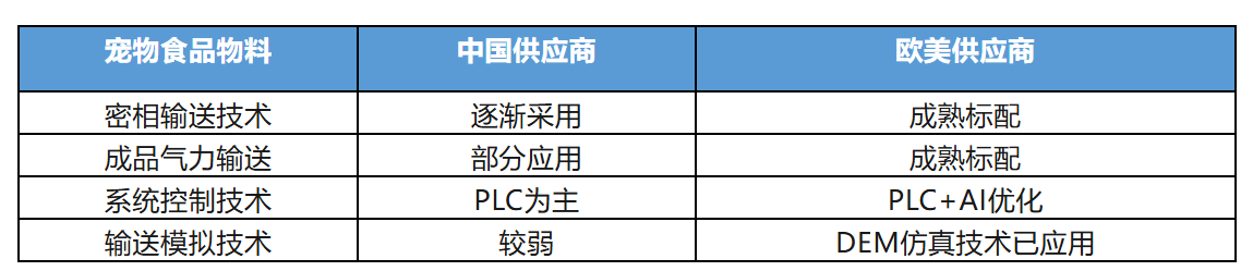 从工艺看,宠物干粮(占主导)、湿粮(高增速)、零食的输送场景差异显著:干粮以谷物粉、颗粒成品为主,核心痛点是防破碎、防粉化;湿粮以肉浆、高粘浆料为主,核心难点是卫生输送、防残留、批次稳定。两类场景共同指向:传统机械输送已无法满足高端需求,密闭气力输送、智能精准配料成为行业技术升级的核心方向。